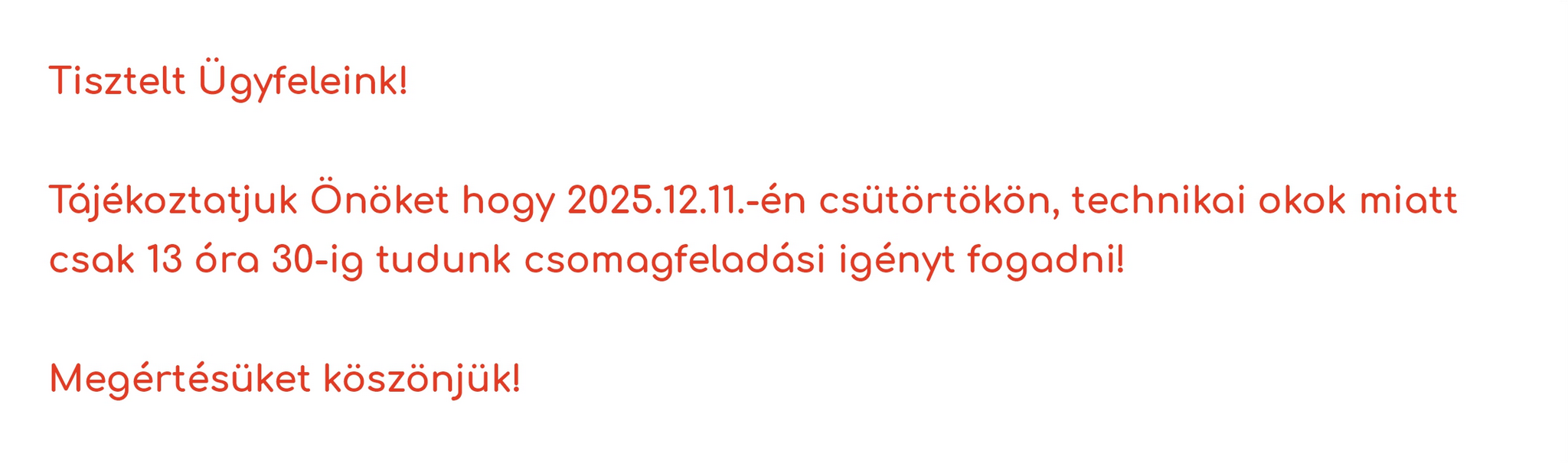 A 15 óráig megrendelt termékekeket még aznap feladjuk.